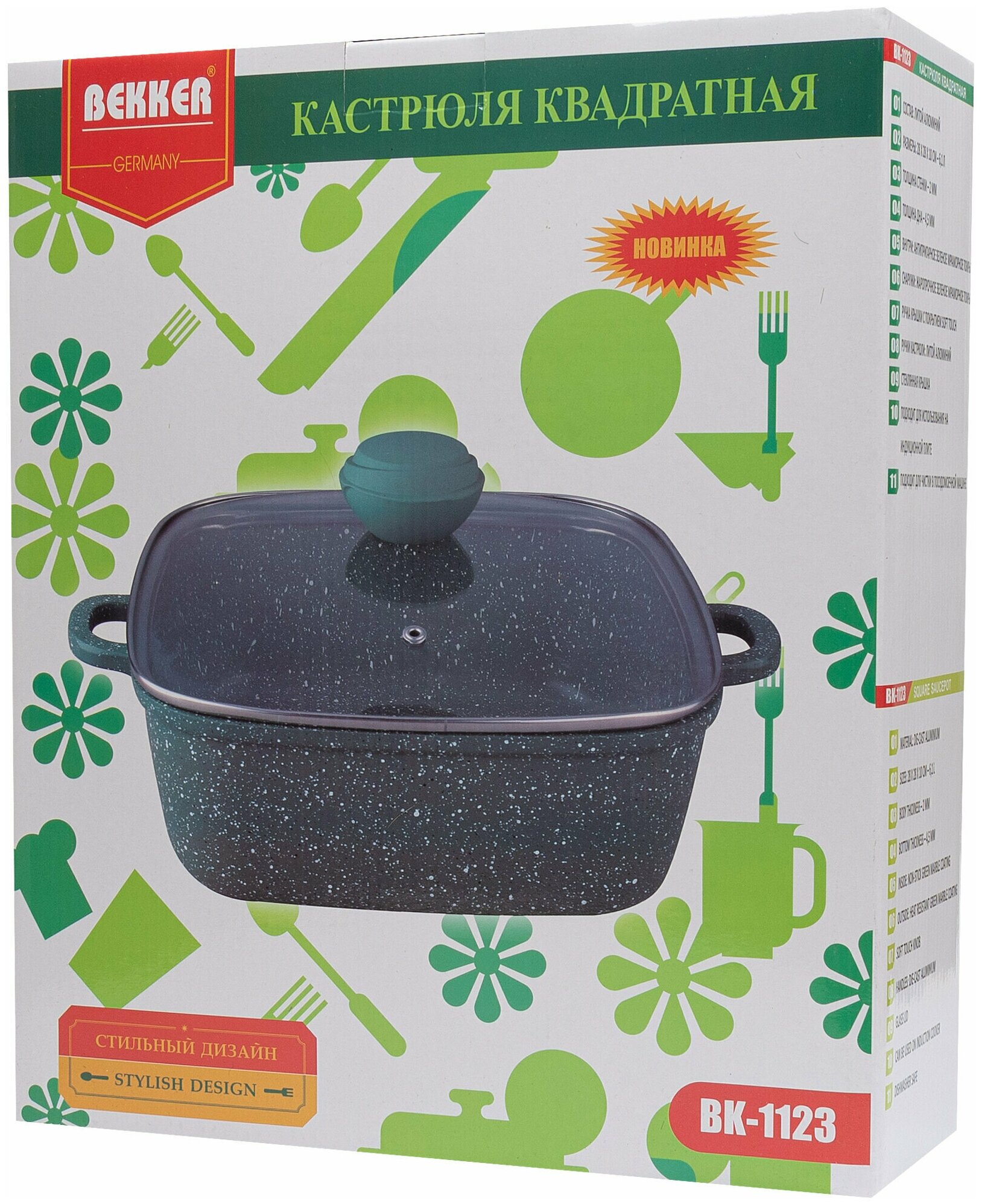 Лучшие цены. Кастрюля квадратная 6,1л. со стеклянной крышкой. Толщина стенки 2,0мм, дна 4,5мм, размеры 28х28х10 см. Внутри антипригарное зеленое мраморное покрытие, снаружи жаропрочное зеленое мраморное покрытие. Ручка крышки с покрытием Soft touch. Ручки кастрюли из литого алюминия. Подходит для индукционных плит и чистки в посудомоечной машине. Состав: литой алюминий. Магазины в вашем городе.