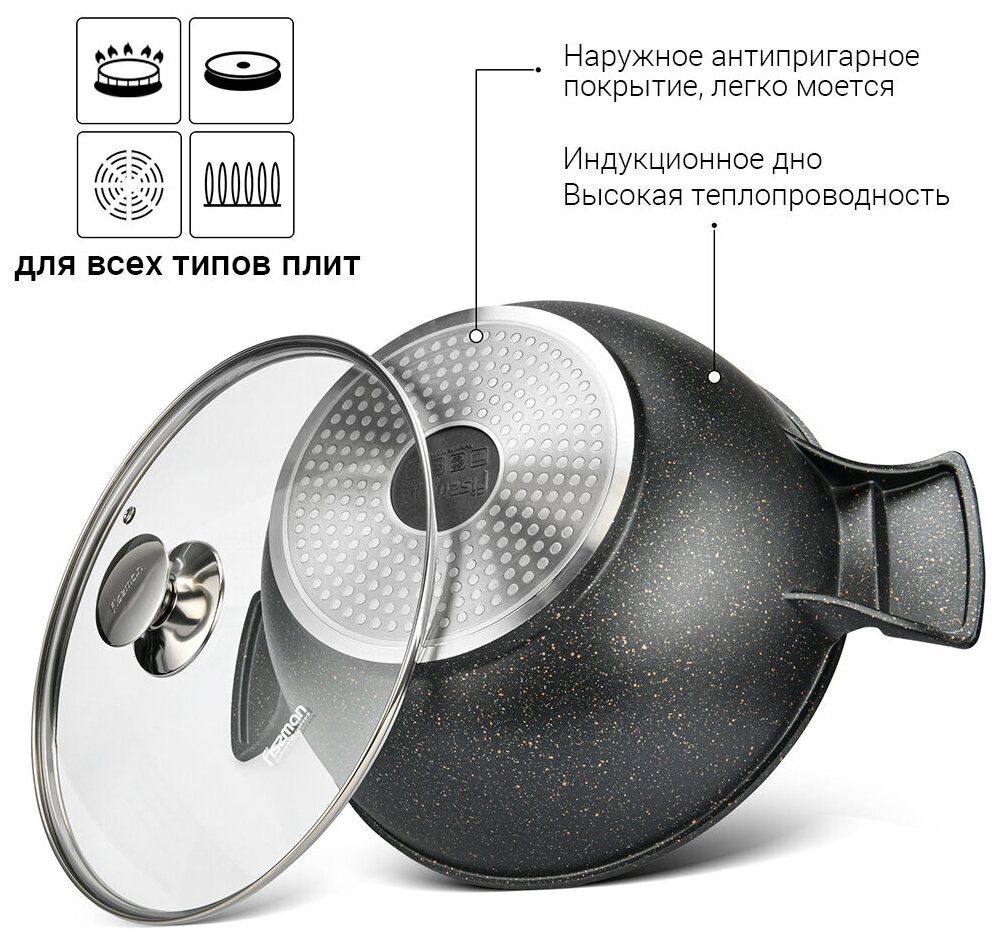 | Дополнительно | совместимость с индукцией / мытье в посудомойке / отверстие для пара / многослойное дно |