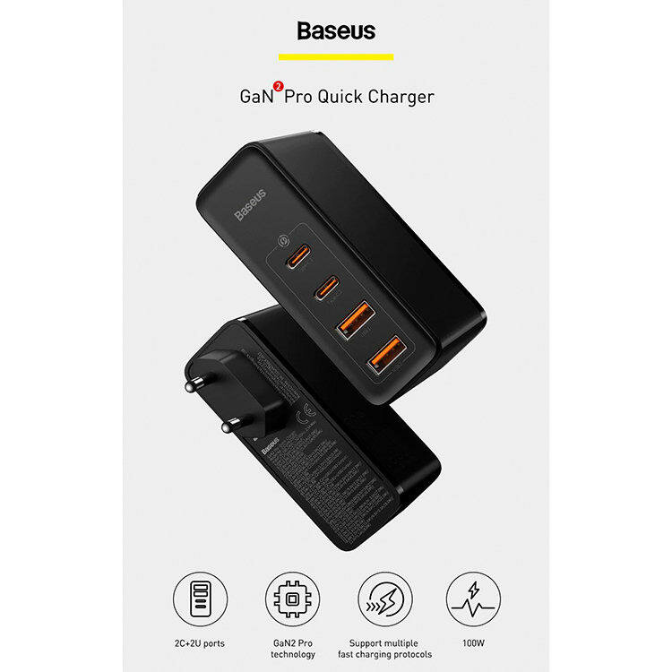 Сетевое зарядное устройство Baseus GaN2 Pro Quick Charger 2C+2U 100W EU Black (CCGAN2P-L01)