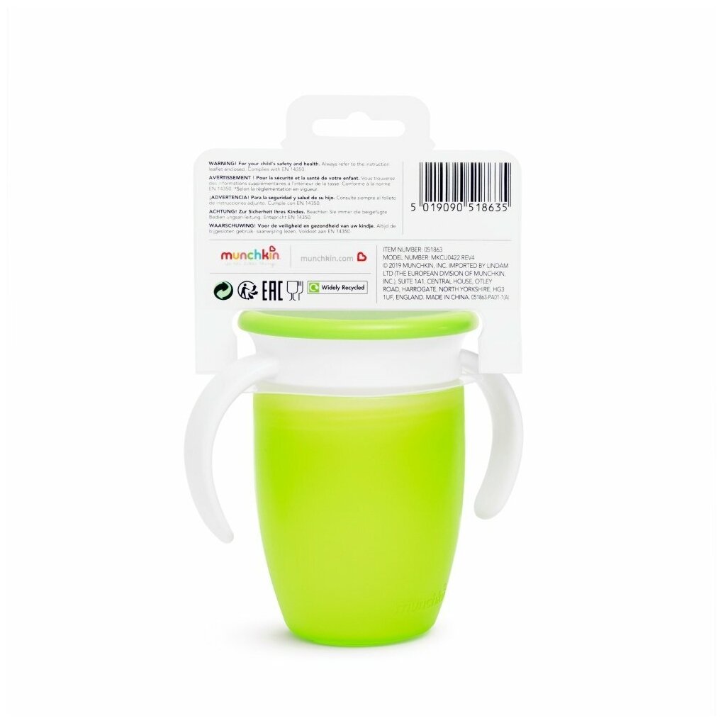 Бутылочки и поилки Поильник с крышкой MIRACLE 360° Munchkin непроливайка, с ручками, 207мл. 6мес+, зеленый