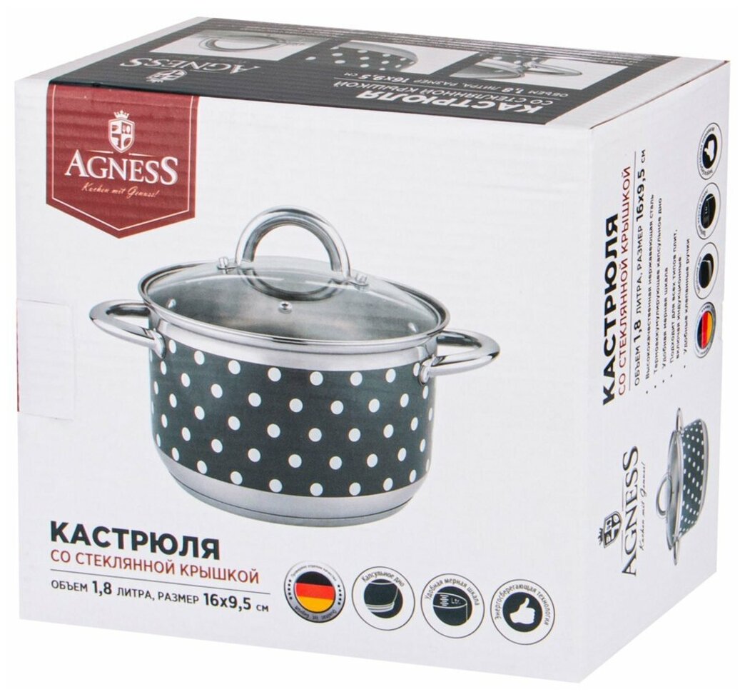 Лучшие цены. Кастрюля со стеклянной крышкой горошек нерж. сталь 1,9 л диаметр 16 см высота 9 см (кор 8шт Agness (937-710). Магазины в вашем городе.