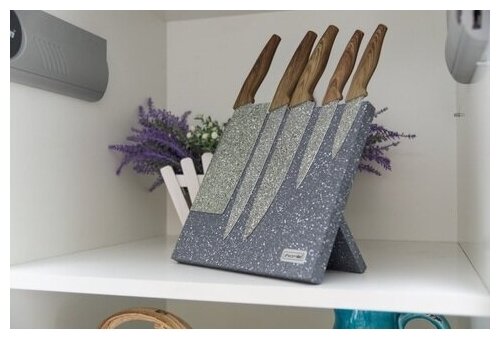 Лучшие цены. Тип: набор ножей. Количество предметов в наборе: 6. Материал лезвия: нержавеющая сталь с мраморным покрытием. Заточка лезвия: односторонняя. Материал рукоятки: бакелит. Комплектация: нож для чистки овощей (9 см), универсальный (12,5 см), Шеф-повар (20 см), нож для нарезки (20 см), чоппер (16 см), подставка. Тип подставки: настольная. Материал подставки: акрил. Упаковка: цветная картонная коробка. Магазины в вашем городе.