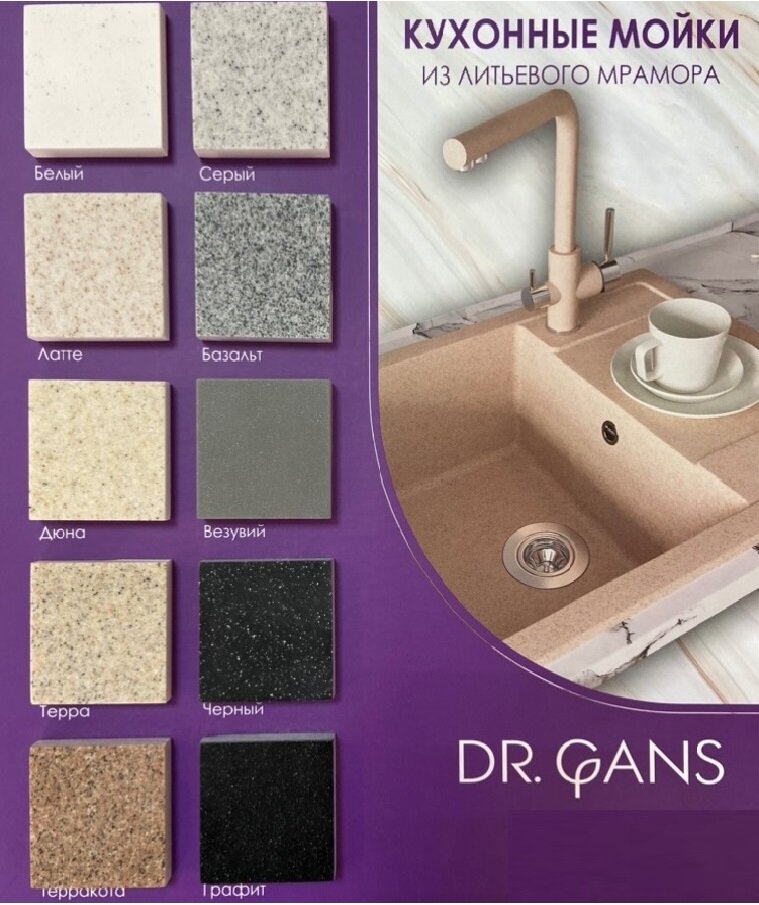 Каменная мойка / раковина для кухни Dr.Gans Smart оливия 740 прямоугольная с крылом, врезная 740х480х200 мм (дюна) сифон в комплекте