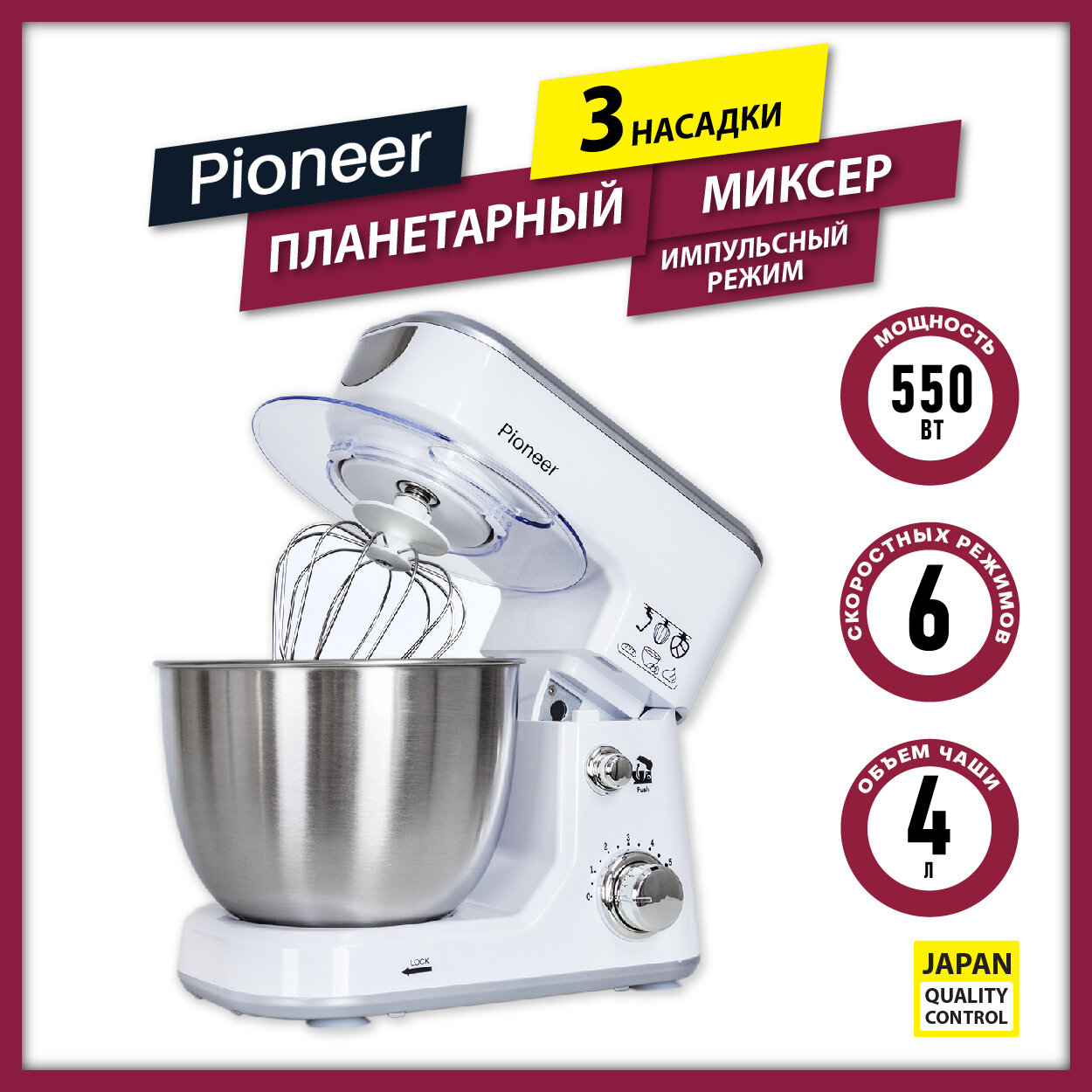 Миксер планетарный Pioneer, кухонная машина с чашей из нержавеющей стали, 6 скоростей, 3 насадки, защита двигателя от перегрева, 550 Вт