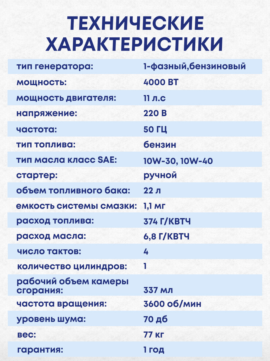 | Функции | авторегулятор напряжения (AVR) / дисплей / счетчик моточасов / вольтметр |