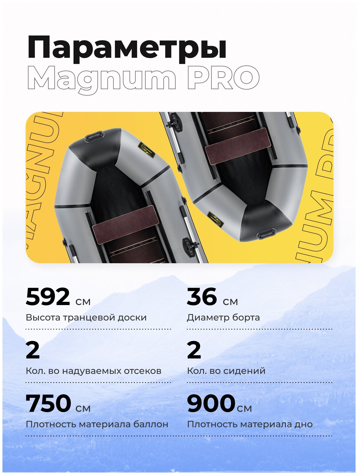 Надувные лодки Лодка ПВХ под мотор надувная двухместная гребная для рыбалки Magnum PRO P280 Sport серая с реечной сланью грузоподьемностью 220 кг.
