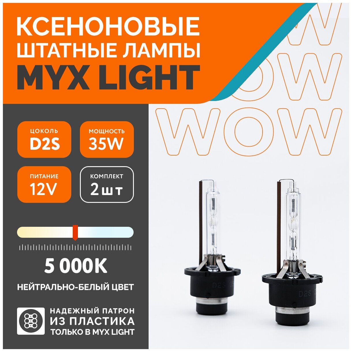 Автолампы Ксеноновые лампы для автомобиля штатный ксенон цоколь D2S температура света 5000K MYX Light питание 12V, мощность 35W, пластиковый цоколь, комплект 2шт.