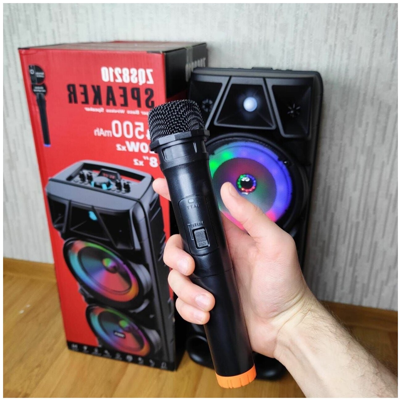 Портативная акустическая система с Bluetooth, USB, AUX, TF, Микрофоном, Радио и караоке 8210 ВТ 400 PMPO - Блютуз-колонка для дома и дачи с подсветкой BT SPEAKER ZQS Музыкальная система с беспроводным блютуз-микрофоном и аукс (AUX) кабелем