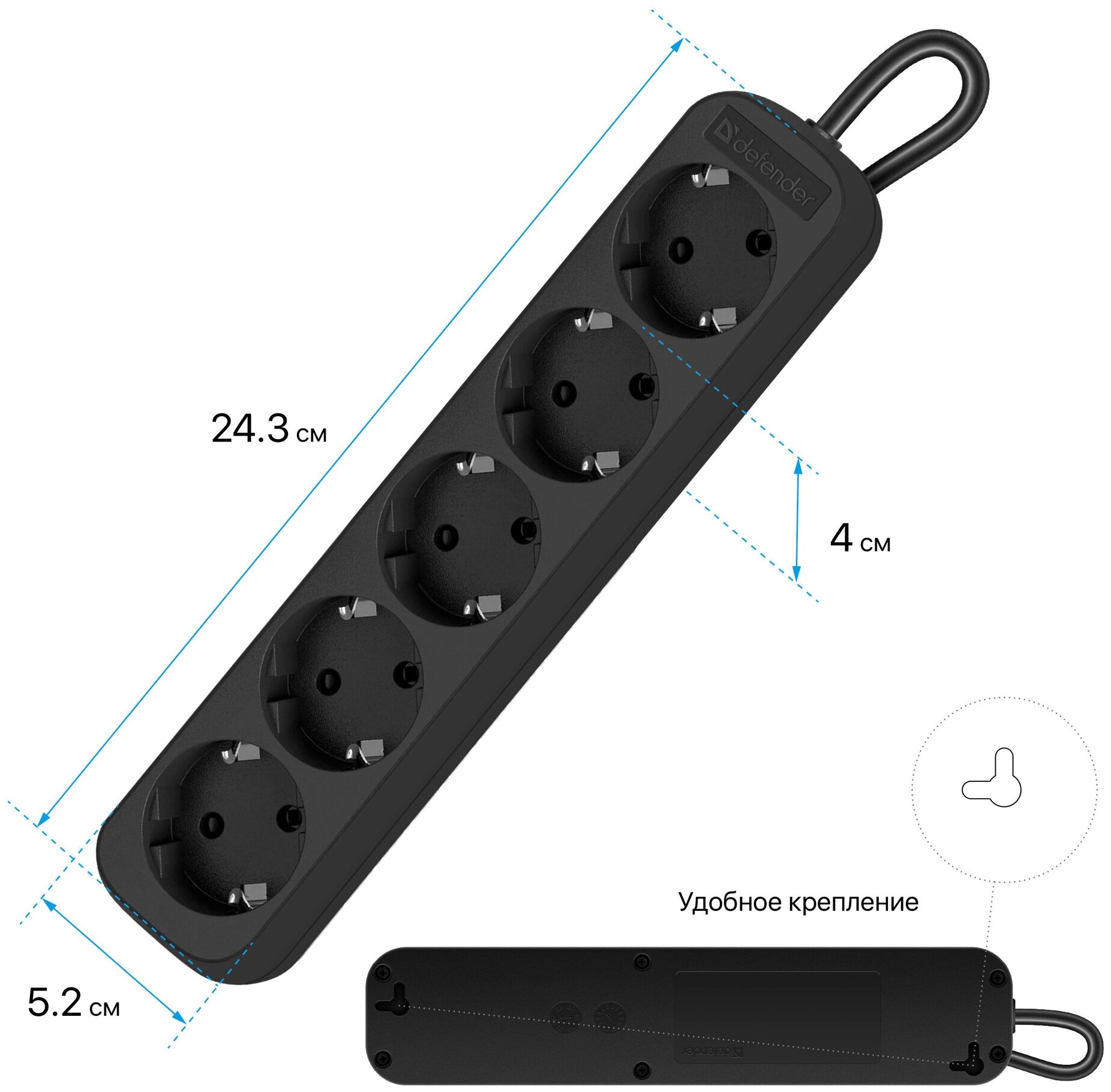 Удлинитель с заземлением Defender M530 3.0 м, 5 розеток, черный