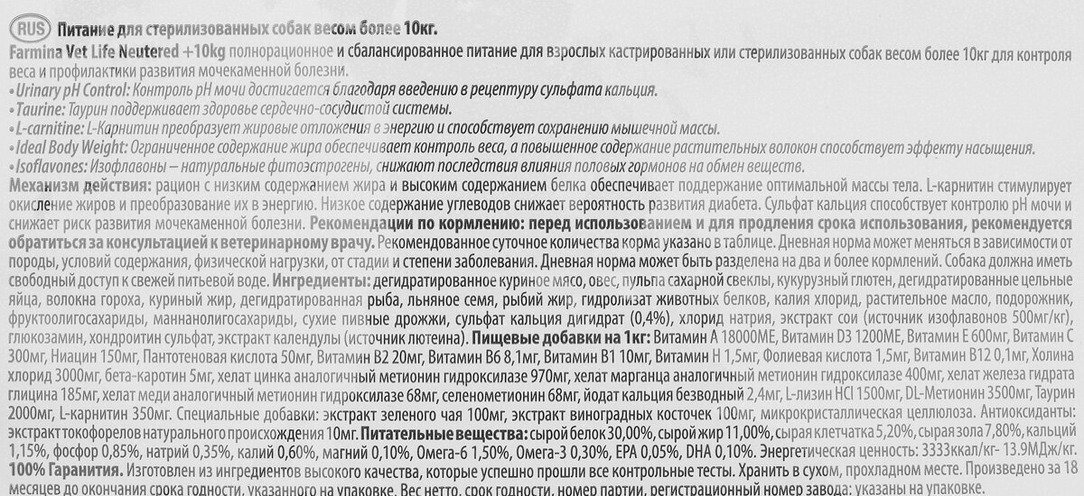 Лучшие цены. Vet Life Dog Neutered +10 kg Питание для стерилизованных собак весом более 10кг. Farmina Vet Life Neutered +10kg — полнорационный и сбалансированный сухой корм для взрослых кастрированных или стерилизованных собак весом более 10кг для контроля веса и профилактики развития мочекаменной болезни. Контроль рН мочи. Контроль рН мочи достигается благодаря введению в рецептуру сульфата кальция. Таурин. Таурин поддерживает здоровье сердечно-сосудистой системы. L-карнитин. Магазины в вашем городе.