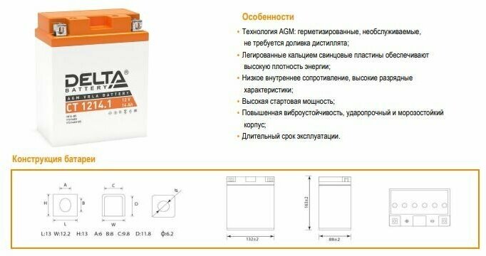 Мото, Скутер 12В 14 А.ч. Delta, 165А,Пр.пол., Ст1214.1 (Yb14bs) (132X88x164) (Залитый) Agm Аккумулят DELTA battery арт. CT12141