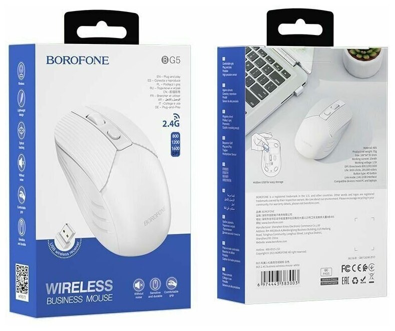 Мышь Borofone BG5, беспроводная, оптическая, 1600 dpi, от одной батарейки ААА, белая