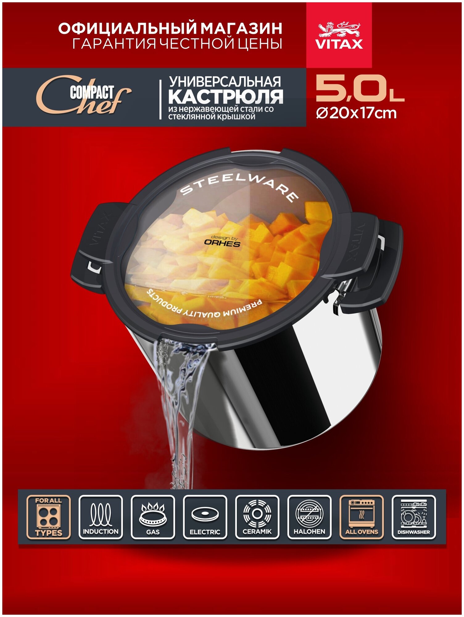 Кастрюля из нержавеющей стали со стеклянной плоской крышкой крышкой-дуршлагом Vitax VX-3803 5л Compact Chef