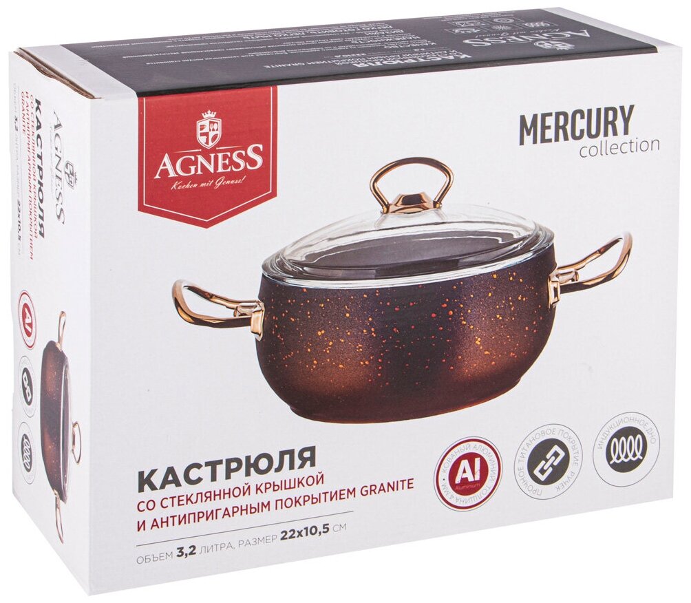 Лучшие цены. Кастрюля AGNESS С антипригар. Покрытием GRANITE, серия MERCURY, 22*10,5СМ, 3,2Л, PFOA FREE Марка AGNESS представляет посуду турецкого производителя серии Mercury. Серия Mercury - это идеальное сочетание традиций и современных технологий. Необычная округлая форма и утолщенные стенки позволяют сохранить тепло внутри посуды и создают эффект томления. Это наилучший способ готовить полезные и вкусные блюда, максимально сохраняя всю пользу и оттенки вкуса. Посуда выполнена из кованного алюминия. Магазины в вашем городе.