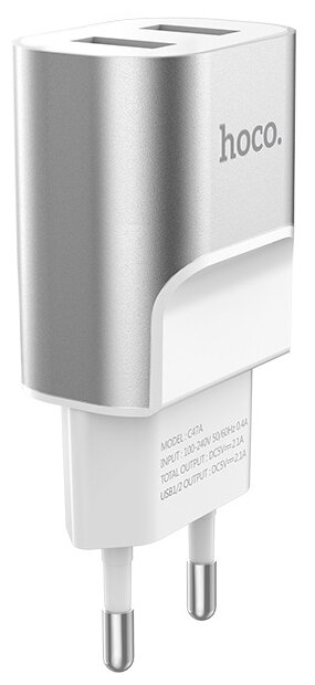 Сетевой адаптер питания Hoco C47A Silver зарядка 2.1А 2 USB-порта, бело-серебристый