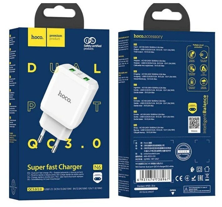 Лучшие цены. Сетевое зарядное устройство HOCO N6 Charmer с функцией быстрой зарядки QC3.0 имеет 2USB выхода, благодаря этому вы можете заряжать два гаджета одновременно. Выходной силы тока 3А достаточно, чтобы заряжать не только телефон, но и планшет. Если задействованы оба разъема, то максимальная сила тока составит 3А и будет делиться пропорционально на два порта. Благодаря широкому диапазону входного напряжения от 100 до 240В сетевой адаптер может использоваться во многих странах мира. Магазины в вашем городе.