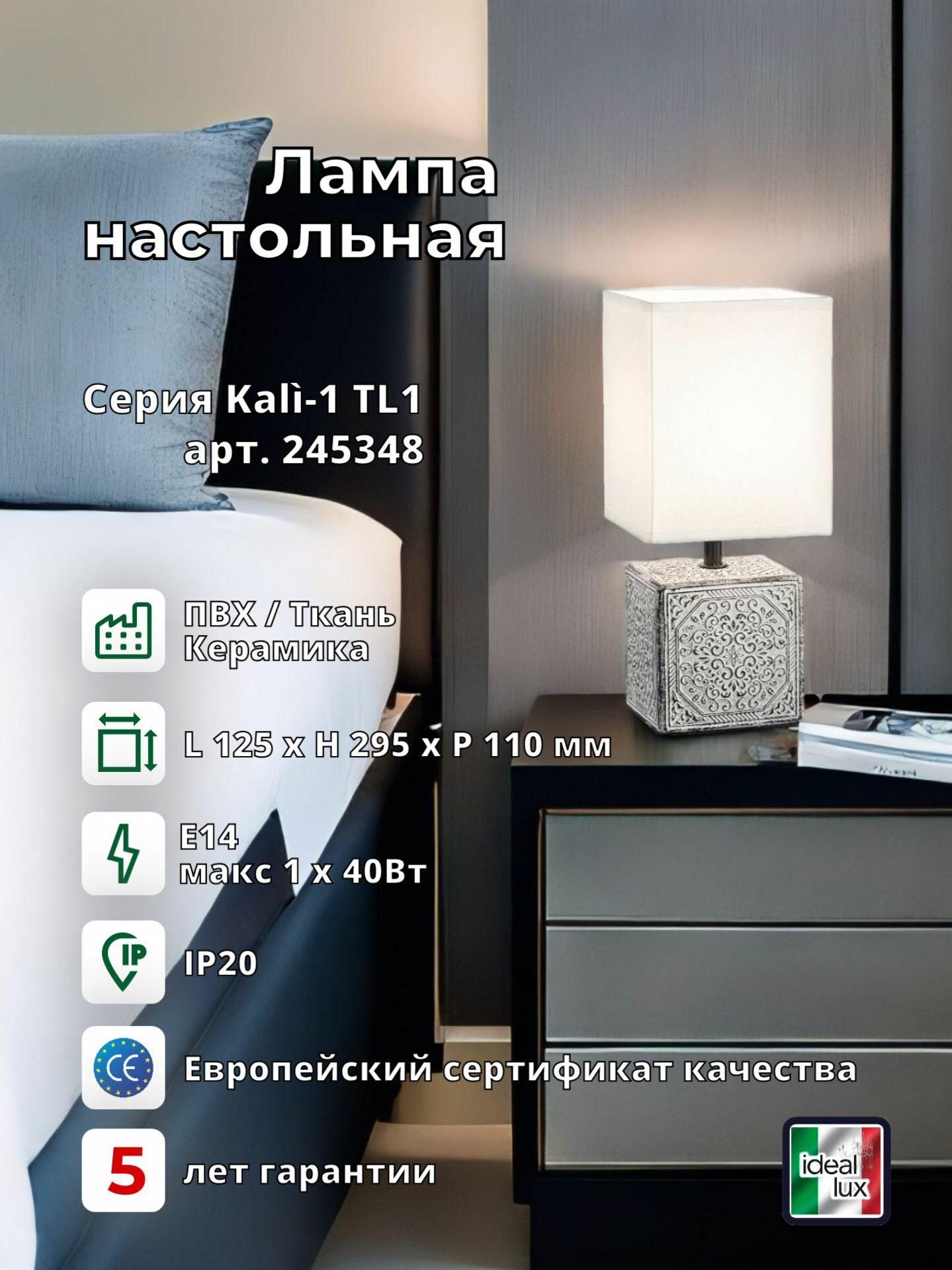 Настольные лампы Лампа настольная ideal lux Kali-1 TL1 макс.1х40Вт IP20 Е14 230В Белый Керамика/ПВХ/Ткань Выключатель Без лампы 245348.
