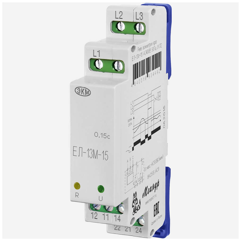 Лучшие цены. Реле контроля трехфазного линейного напряжения "Меандр" ЕЛ-13М-15 AC400В УХЛ4 Реле асимметрии фаз ЕЛ-13М-15 предназначено для контроля трехфазного линейного напряжения в трехпроводных сетях (без нейтрали). Реле контролирует обрыв и "слипание" фаз, асимметрию (разбаланс) линейных напряжений, превышение напряжения выше фиксированного значения. Размеры Функциональные возможности Контроль трехфазного линейного напряжения для крановых электродвигателей. Контроль асимметрии фаз. Магазины в вашем городе.
