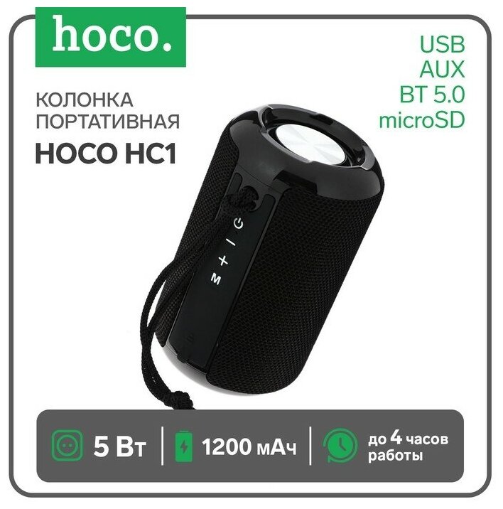 Портативная колонка Hoco HC1, 5 Вт, 1200 мАч, BT5.0, microSD, USB, AUX, FM-радио, черная 7686828