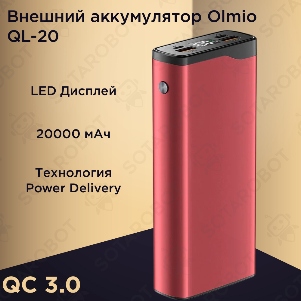 Лучшие цены. Внешний аккумулятор OLMIO QL-20 Компактный, но при этом мощный внешний аккумулятор QL-20 рассчитан на 20 000 мАч. Модель создана для подзарядки смартфонов, планшетов, некоторых моделей ноутбуков. Внешний аккумулятор поддерживает быструю зарядку. При этом устройство не только быстро заряжает гаджеты с поддержкой Quick Charge. QL-20 также поддерживает технологию Power Delivery, т. е. способ передать через разъем Type-C ток с максимальной выходной мощностью 20 Ватт. Модель представлена в трех разных цветах. Магазины в вашем городе.