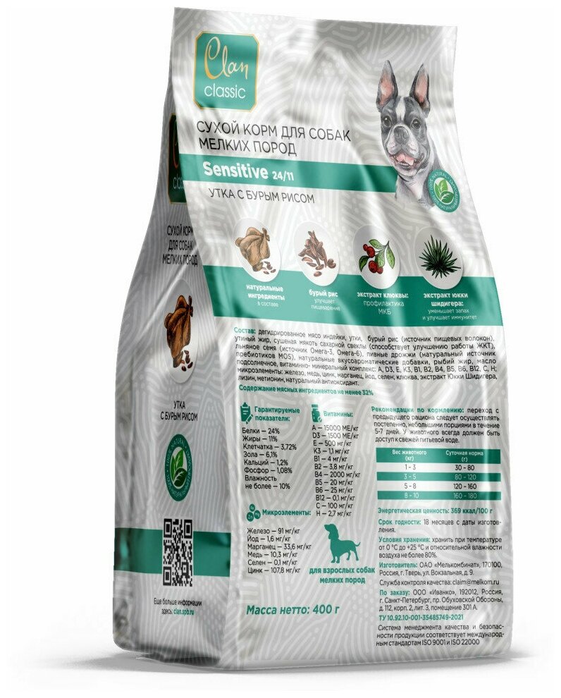Clan Корм сухой для собак мелких пород Сlassic Sensitive-24/11, утка с бурым рисом, 400 г
