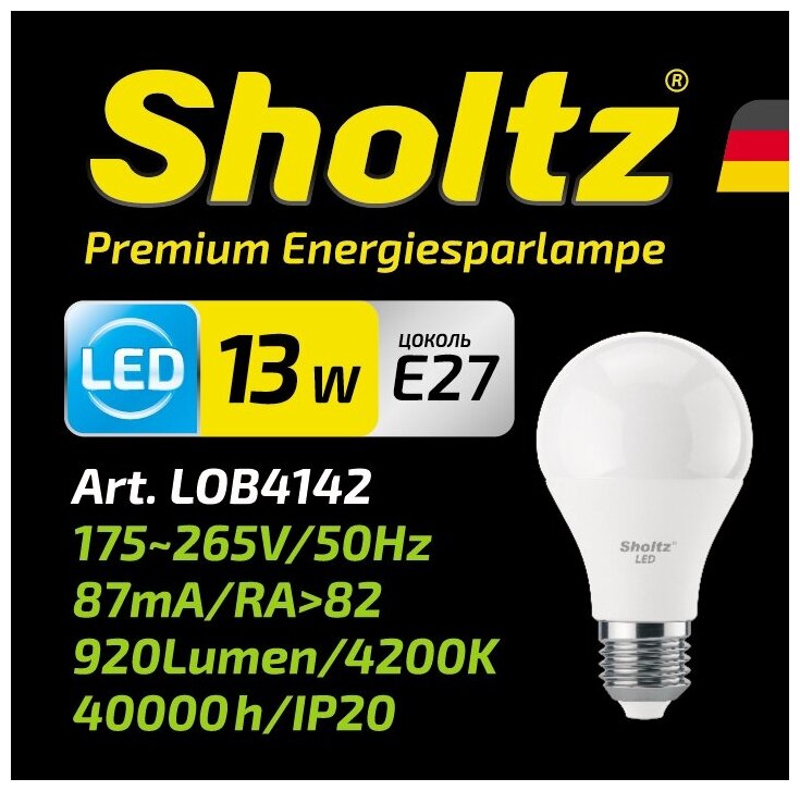 Лучшие цены. Премиальная, светодиодная, энергосберегающая лампа SHOLTZ - безопасный, энергоэффективный и долговечный источник света. Произведенная, по передовым технологиям с использованием лучших электронных компонентов, лампа SHOLTZ гарантирует Вам: Экономию электроэнергии до 85% от эквивалентной лампы накаливания. Общее время работы 40 000 часов (в 40 раз больше чем у лампы накаливания). Срок службы 20 лет (при использовании 5,5 часов в день). Магазины в вашем городе.