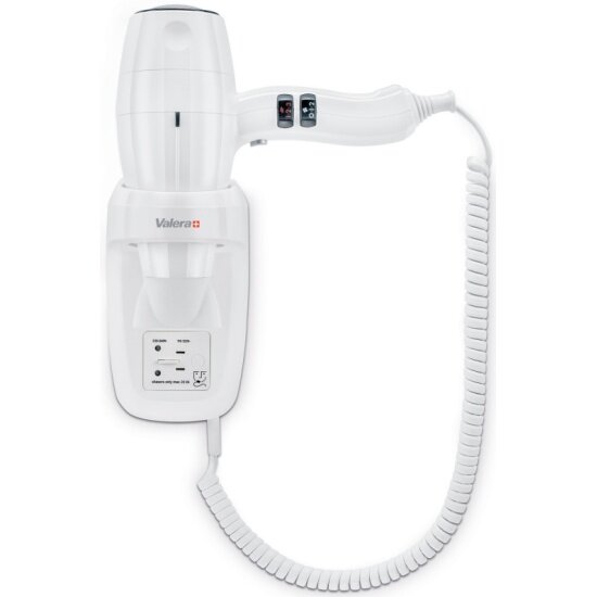 Фен настенный Valera Hospitality Silent Jet Protect 2000 Shaver (586.10/044.06), мощность 2000 Вт, сверхтихий, безопасная кнопка включения/выключения, настенный держатель c устройством защитного отключения, технология быстрой сушки, розетка для бритвы