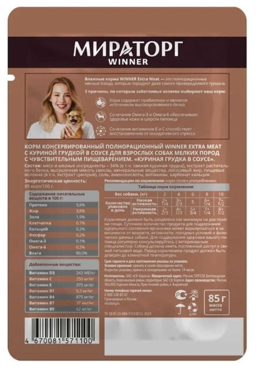 Мираторг WINNER EXTRA MEAT консервированный корм для взрослых собак мелких пород c чувствительным пищеварением куриная грудка в соусе 85 г х 24 шт