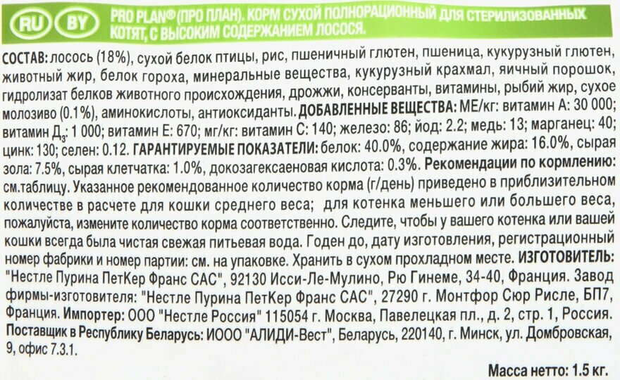 Лучшие цены. Котенок находится в фазе активного роста, поэтому ему нужно большего белка и оптимальное сочетание витаминов и минералов. В то же время, питание для стерилизованных котят должно быть умеренно калорийным: после стерилизации питомец становится менее активным и может набрать лишний вес. В ряду рационов для кошек PRO PLAN наши эксперты разработали сухие корма Sterilised Kitten, чтобы Ваш питомец с самого начала получал потенциал для долгой здоровой жизни. Магазины в вашем городе.