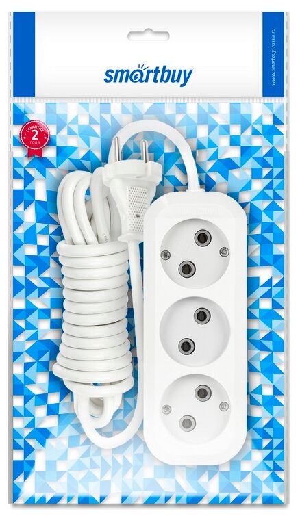 Удлинитель SmartBuy SBE-10-3-02-N/SBE-10-3-03-N/SBE-10-3-05-N, 3 розетки, б/з, 10А / 2200 Вт белый 3 м 1 м² 3