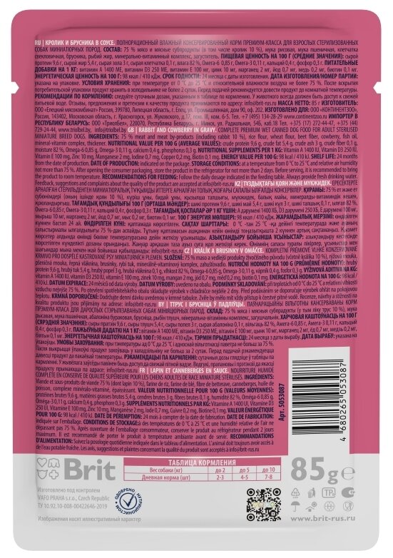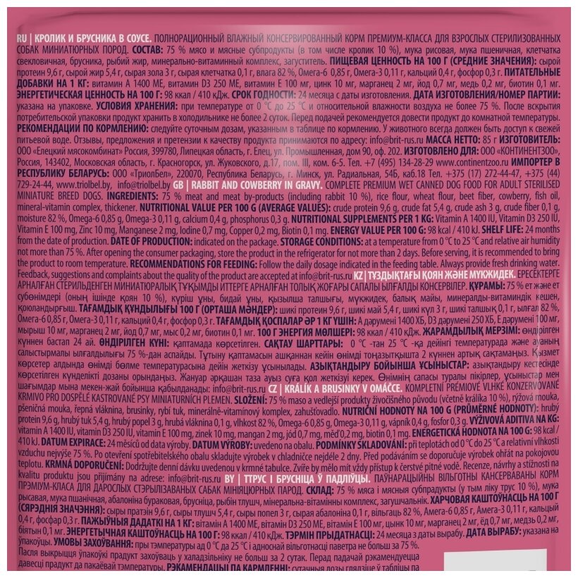 Влажный корм для Стерилизованных Собак Мини Пород. Пауч Кролик и Брусника 85гр, 14шт Brit Premium