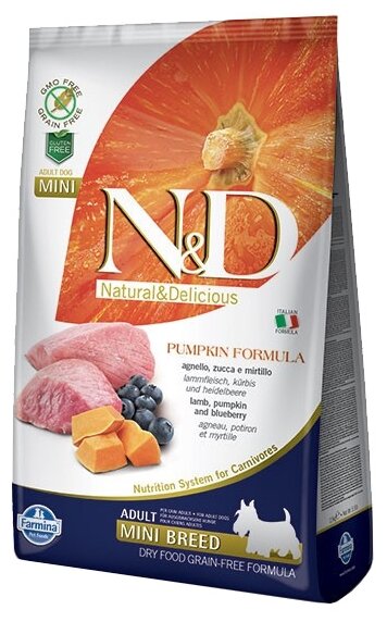Корм для собак сухой Фармина N&D Pumpkin Mini Adult Беззерновой для мелких пород животных, гранулы с ягненком, черникой и тыквой 2.5кг /