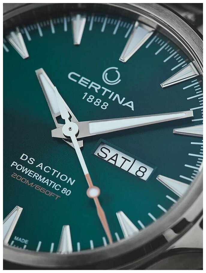 Лучшие цены. Швейцарские мужские механические часы Certina DS Action Day-Date C032.430.11.091.00 из коллекции DS Action подчеркнут ваш повседневный образ и добавят лаконичности. Брендовая модель имеет изумрудный циферблат с контрастными стрелками и часовой разметкой, что обеспечивает хорошую читаемость показателей в любых условиях. Стальной браслет надёжно обхватывает запястье, а {=templateTooltip "butterfly_clasp_with_push_buttons" "застёжка «бабочка» с кнопками"} предотвращает случайное. Магазины в вашем городе.