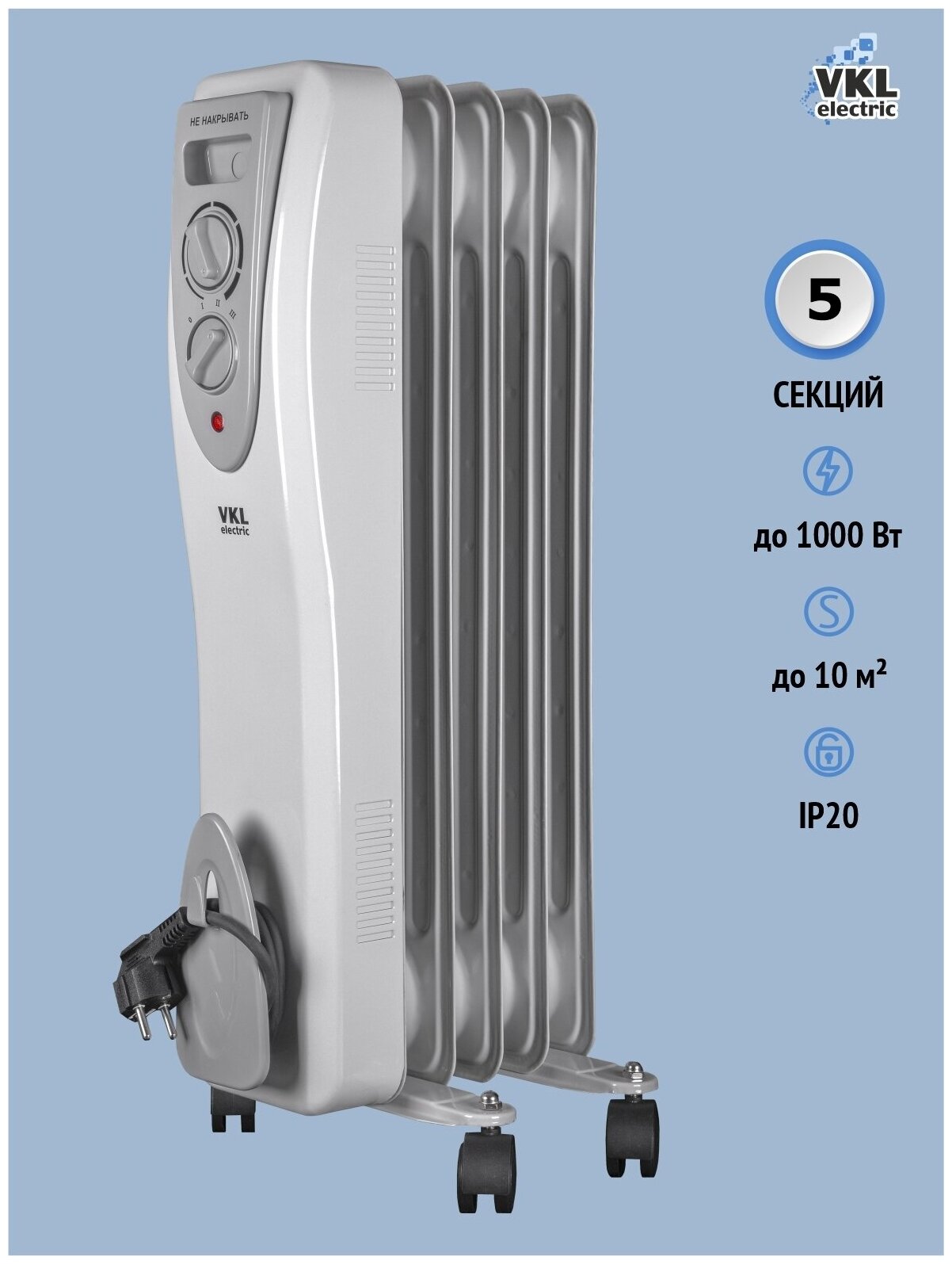 Лучшие цены. Радиатор масляный VKL-OH-10. Количество секций - 5. Мощность по ступеням (низкая/средняя/высокая): 400/600/1000 Вт. Площадь обогрева до 10м2. Регулируемый термостат. Световой индикатор работы. Наличие колёсиков обеспечивает легкость перемещения прибора. VKL electric. Магазины в вашем городе.