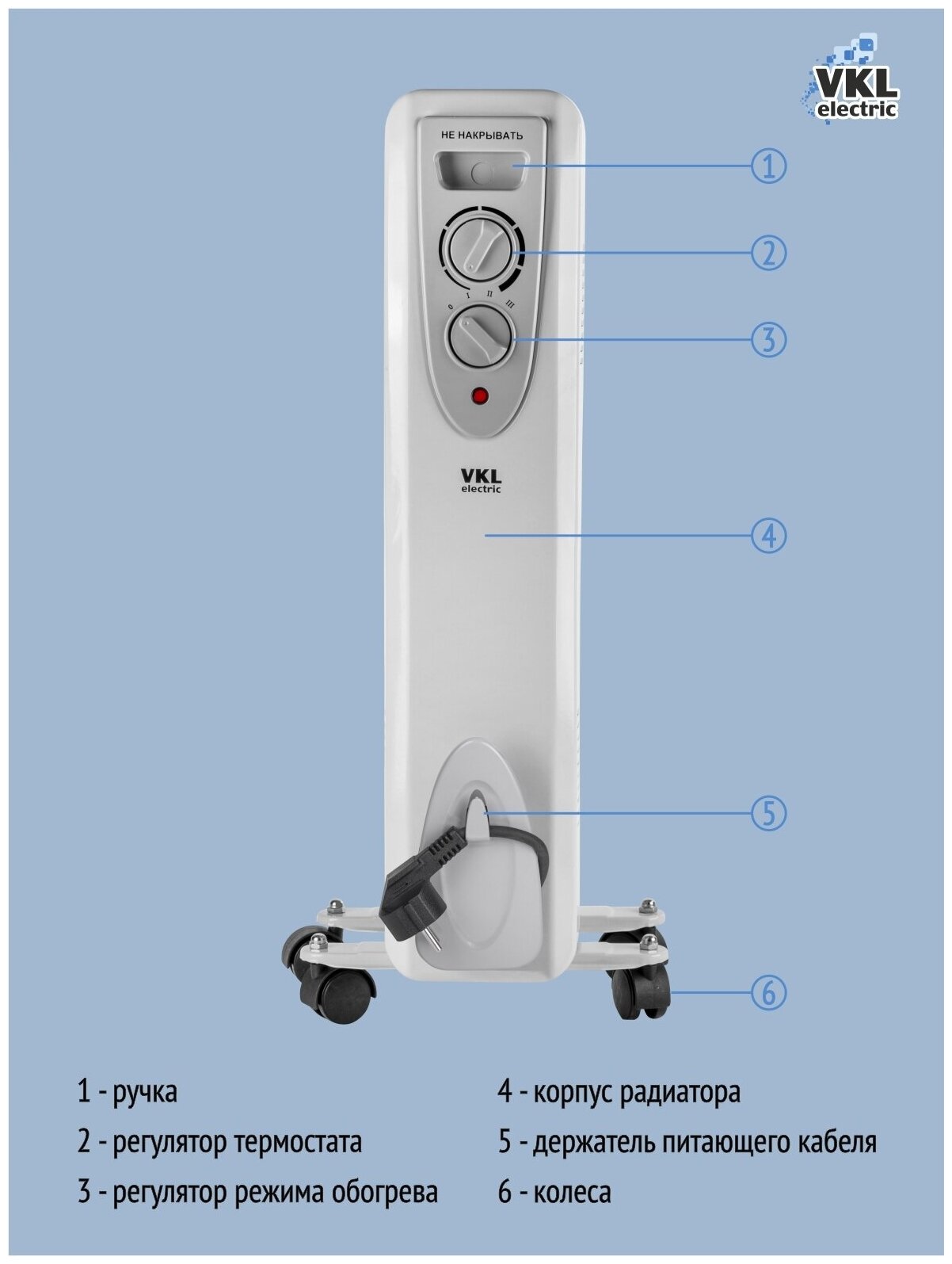 Лучшие цены. Радиатор масляный VKL-OH-15. Количество секций - 7. Мощность по ступеням (низкая/средняя/высокая): 600/900/1500 Вт. Площадь обогрева до 15м2. Регулируемый термостат. Световой индикатор работы. Наличие колёсиков обеспечивает легкость перемещения прибора. VKL electric. Магазины в вашем городе.