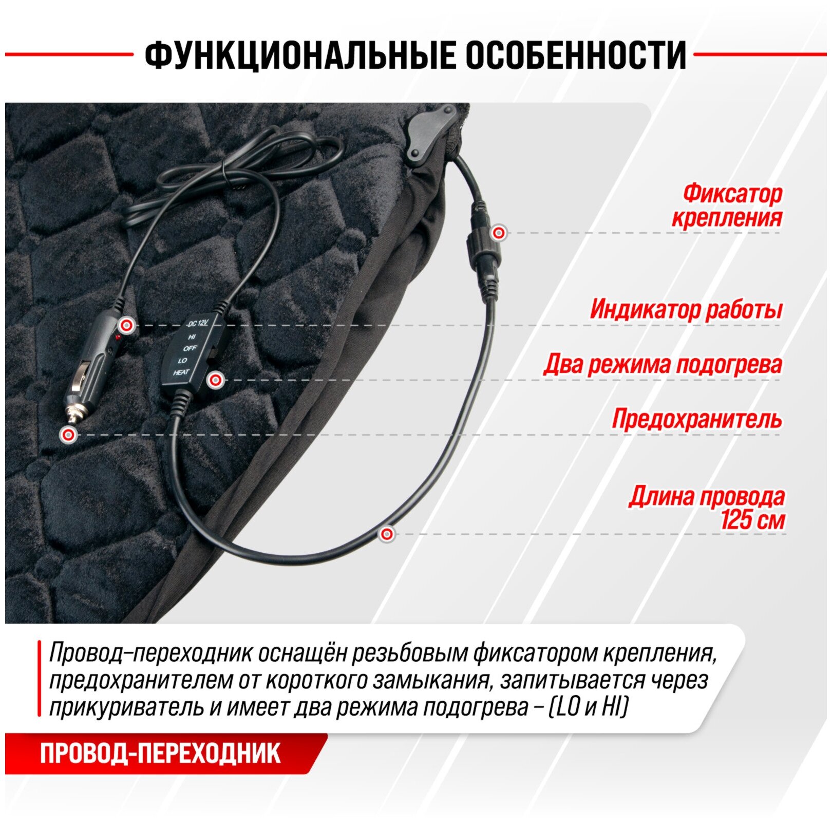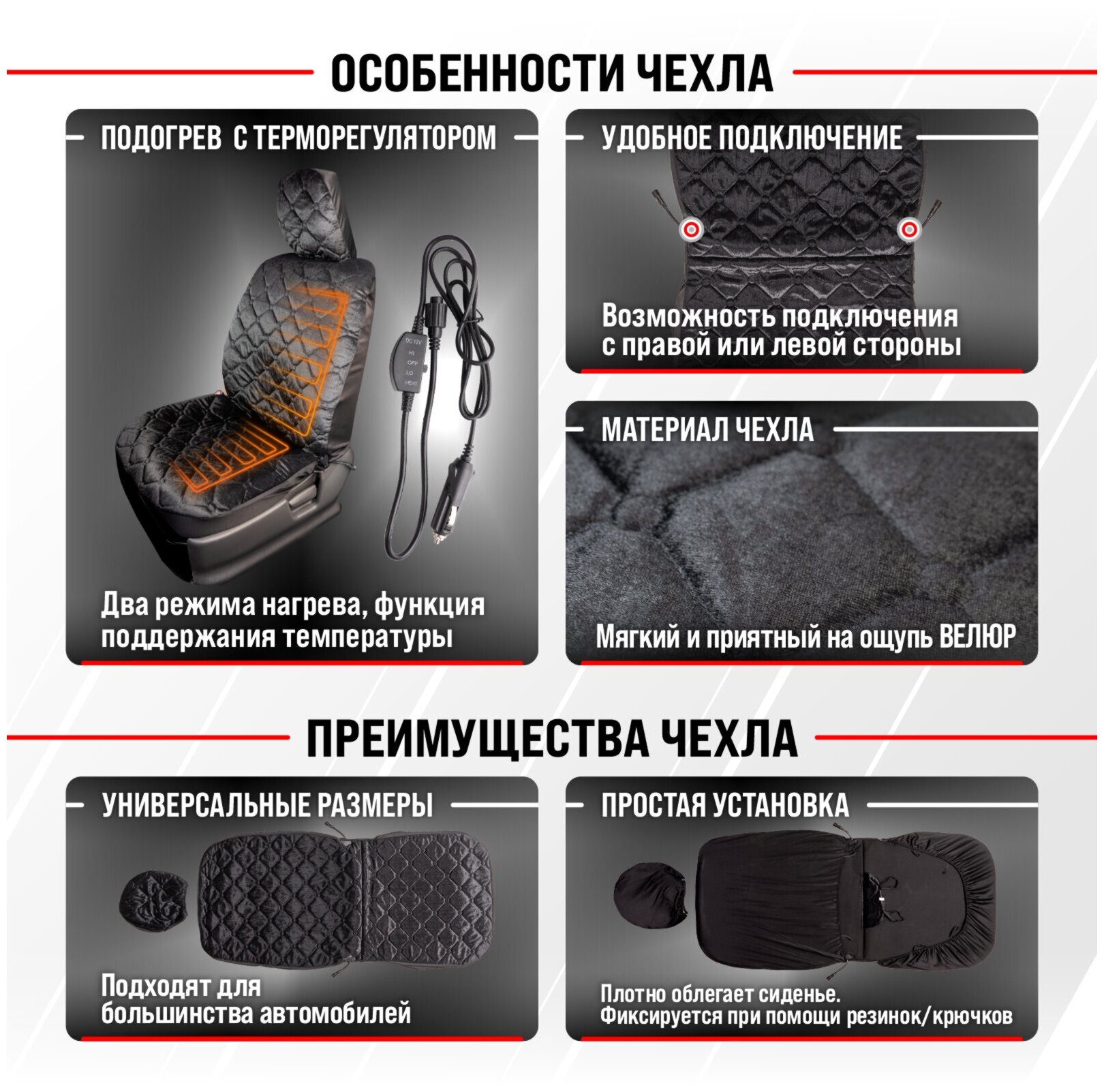 Лучшие цены. Чехол сиденья с подогревом велюр SKYWAY с терморегулятором (2 режима) Черный Стеганный 12V 116х56см 2,5А-3А (2 шнура: справа, слева) - универсальный чехол с функцией подогрева обеспечивает комфорт в поездке и согревает в холодное время года. Подогрев сиденья осуществляется равномерно, благодаря терморегулятору и двух режимов работы. ! Во всех подогревах сиденья TM SKYWAY в качестве теплоносителя применяется углеродный материал. Магазины в вашем городе.
