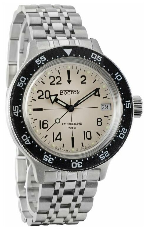 Лучшие цены. Мужские российские механические наручные часы Восток Амфибия 720074 с автоподзаводом. Оригинальный дизайн циферблата. Пружинный механизм с точностью +60/- 20 сек в сутки. Механизм калибра 24мм с центральной секундной стрелкой. В механизме рубиновых камней — 32. Запас хода до 31 часа. Частота 19800 полуколебаний в час. Окошко даты. Стрелки часов покрыты безопасным люминесцентным покрытием, которое светится в темноте. Противоударное устройство оси баланса от небольших механических воздействий. Магазины в вашем городе.