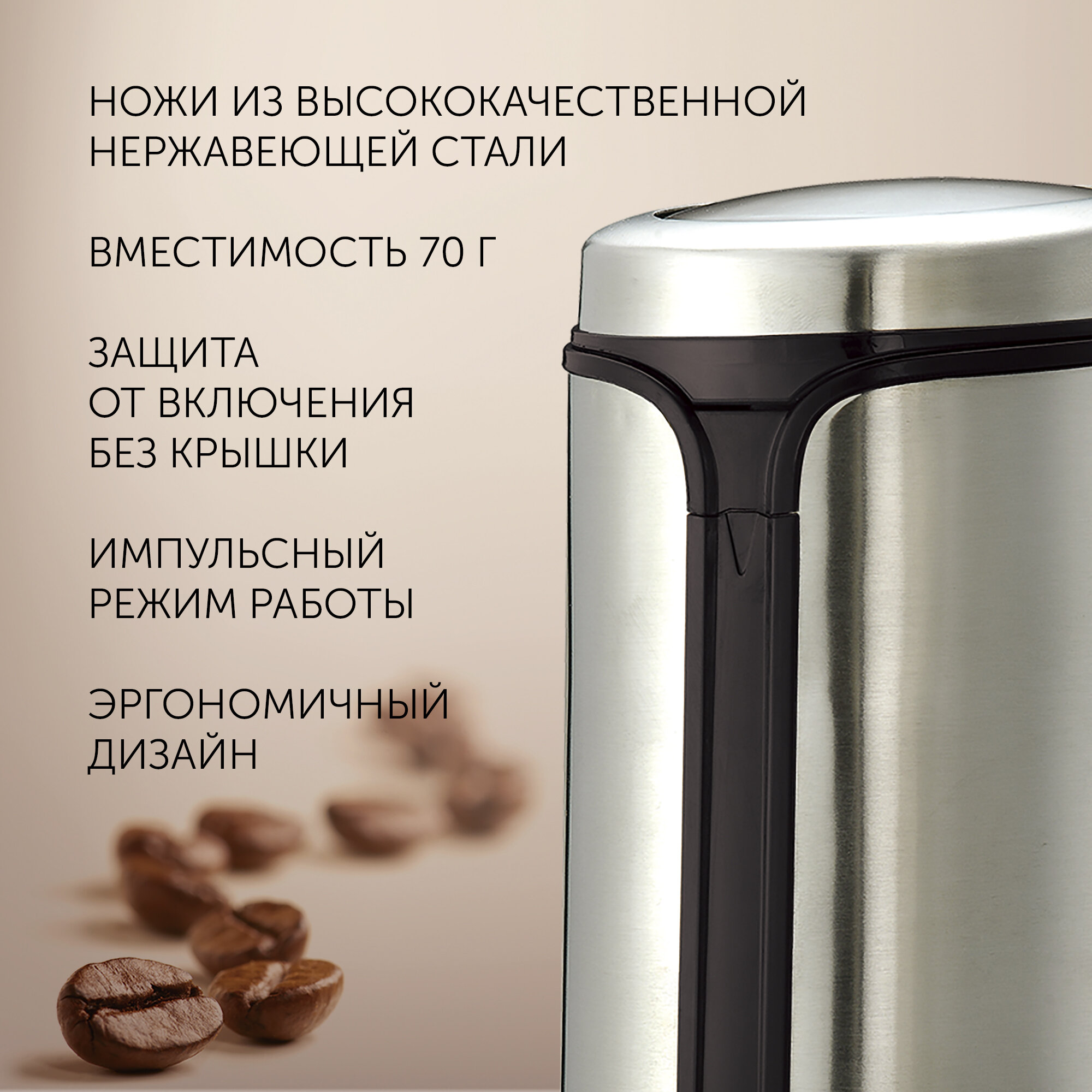 Кофемолка Polaris PCG 0815A, электрическая, ножевая, 150 Вт, 70 г, серебристая