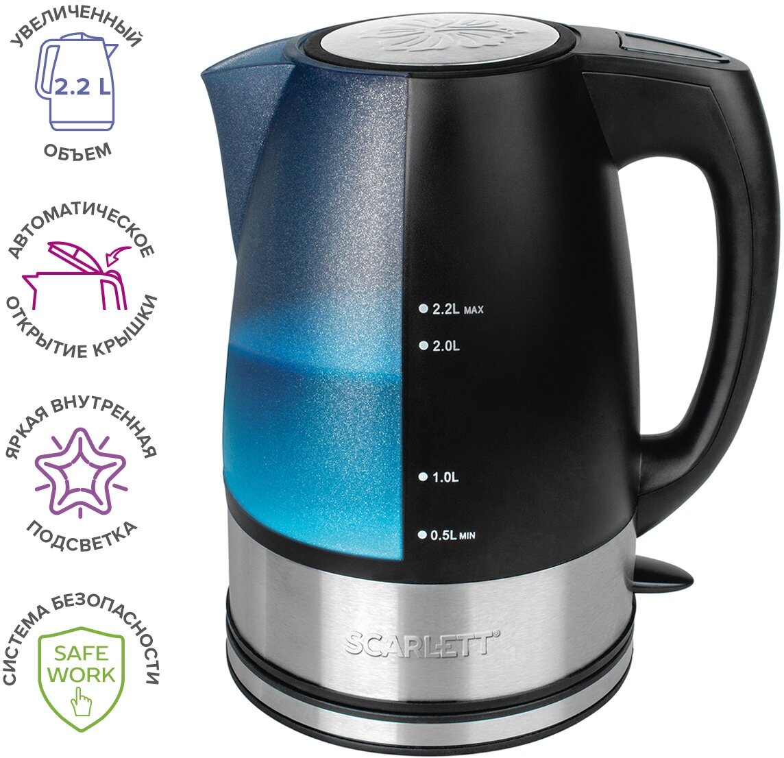Лучшие цены. Чайник Scarlett SC-1020, 2.2л, 2200Вт, (черный) Электрический чайник SCARLETT SC-1020 практичен своим объемом 2,2 л для больших компаний. Выполнен в стильном приятном дизайне - наличие подсветки превращает процесс кипячения воды в увлекательное световое представление. Корпус модели выполнен из полупрозрачного пластика - абсолютно безвредного материала, не влияющего на свойства воды. Крышка электрического чайника SCARLETT SC-1020 украшена рельефным рисунком в виде цветка. Магазины в вашем городе.