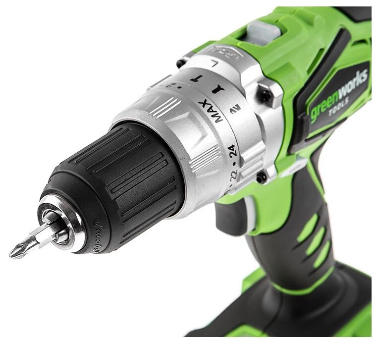 Лучшие цены. Аккумуляторная дрель-шуруповерт Greenworks G24CD серии 24V - сочетает в себе три функции: сверление с ударом, сверление без удара и работа с шурупами. Предназначена для бытового применения, но может справиться и с более тяжелыми профессиональными задачами. Дрель работает от аккумулятора 24 В, что на 33% мощнее обычного 18-ти вольтового стандарта на рынке дрелей. Важным плюсом этого аккумулятора является то, что он совместим с более 20 устройствами линейки Greenworks G-24 24V. Магазины в вашем городе.