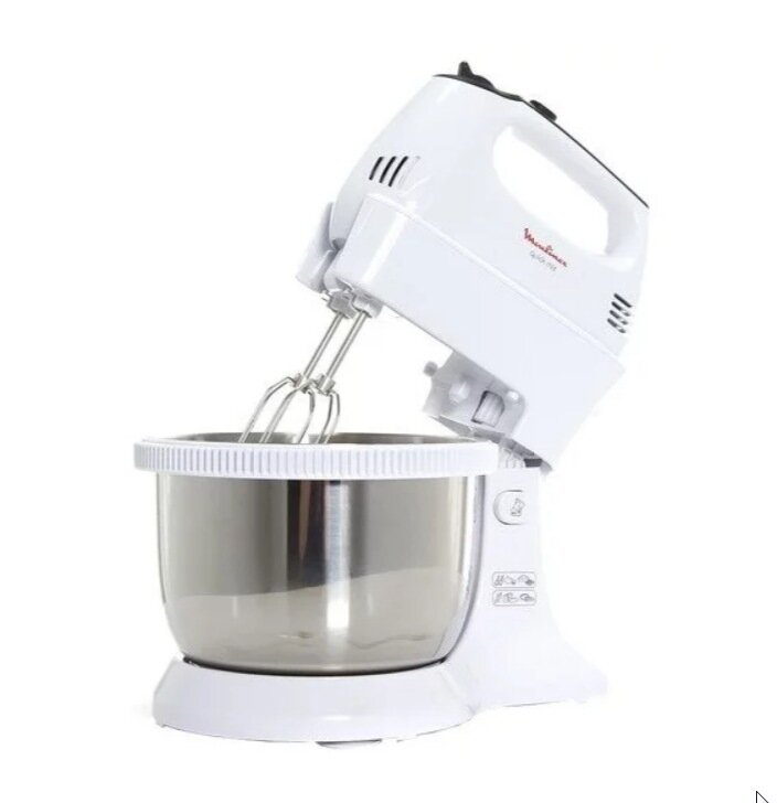 Лучшие цены. Товар сертифицирован, Гарантия производителя. Миксер Moulinex HM3121B1, стационарный миксер, вращающаяся чаша, мощность 300 Вт, крючки для замешивания теста, венчик для взбивания, кнопка отсоединения насадок, вес 2.2 кг. Магазины в вашем городе.
