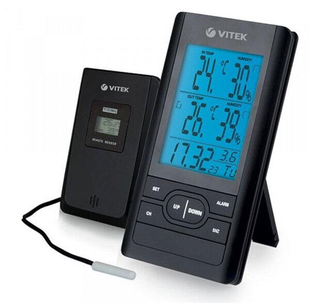 Лучшие цены. Беспроводная метеостанция VITEK VT-3532 BK пригодится как человеку, живущему за городом, так и обитателю городской квартиры. С её помощью легко можно получить информацию о температуре и влажности в комнате и за её пределами. широкие возможности В комплект входит беспроводной датчик, который можно вынести за пределы помещения. Он собирает информацию о температуре и влажности на улице и передаёт её на расстояние до 30 метров. Магазины в вашем городе.