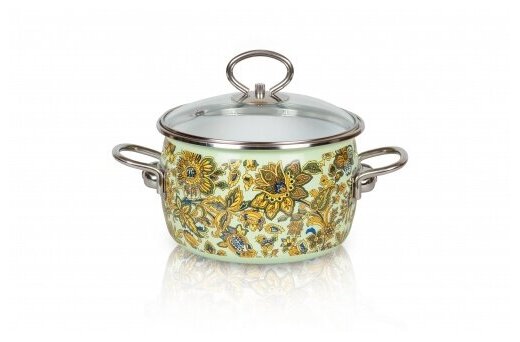 Лучшие цены. Эмалированная сферическая кастрюля d-20см со стеклянной крышкой с пароотводом. Кастрюля и крышка оснащены ободком из нержавеющей стали, прутковые ручки из нержавеющей стали. Двухслойное эмалированное покрытие, с круговым декором. Толщина дна и стенок 0,8мм. Подходит для всех видов плит. Можно мыть в посудомоечной машине. Магазины в вашем городе.