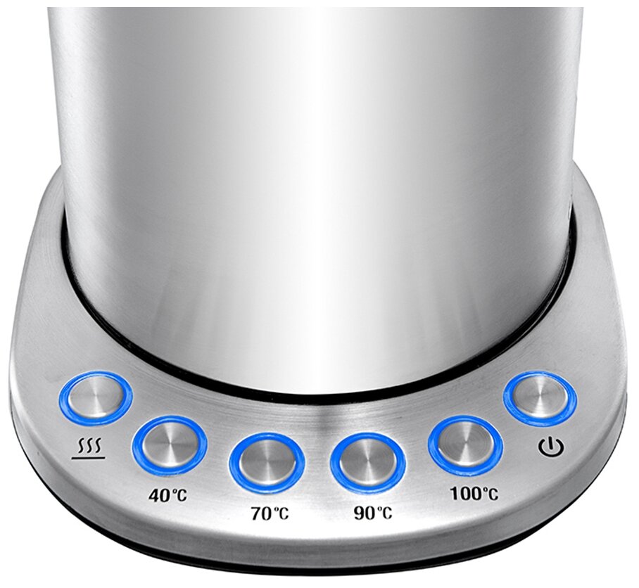 Лучшие цены. Электрический чайник с терморегулятором может не только вскипятить воду, но и нагреть её до температуры 40, 70 и 90°С, что очень удобно при заваривании различных сортов чая. Температура 40°С пригодится для приготовления детского питания. Чайник оснащён функциями: поддержание температуры в течение 1 часа, автоматическим отключением при закипании, защитой от перегрева, автоматическим отключением при снятии с подставки. Температура воды контролируется встроенным в дно чайника термодатчиком. Магазины в вашем городе.