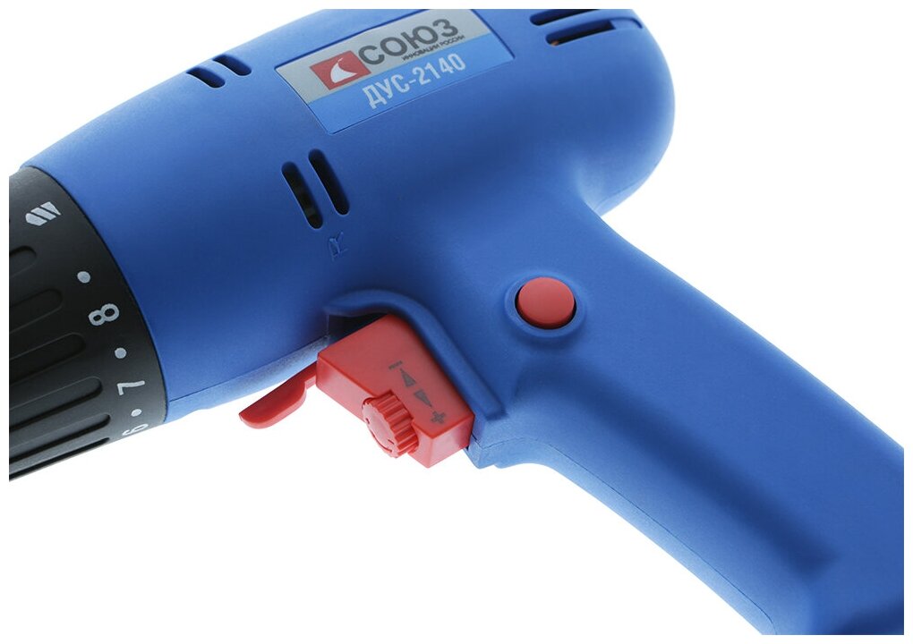 Лучшие цены. Сетевая дрель-шуруповёрт Союз ДУС-2140 - электроинструмент, работающий от сети (220 В/50 Гц). Используется для работы с крепежами и сверления отверстий в домашних условиях. Прибор оснащён удобным быстрозажимным патроном для быстрой смены оснастки. Наличие реверса расширяет функциональность прибора. Предусмотрена фиксация клавиши пуска в положении "старт" для продолжительной работы. Качественные комплектующие и надежный двигатель обеспечивают бесперебойную эксплуатацию инструмента. Магазины в вашем городе.