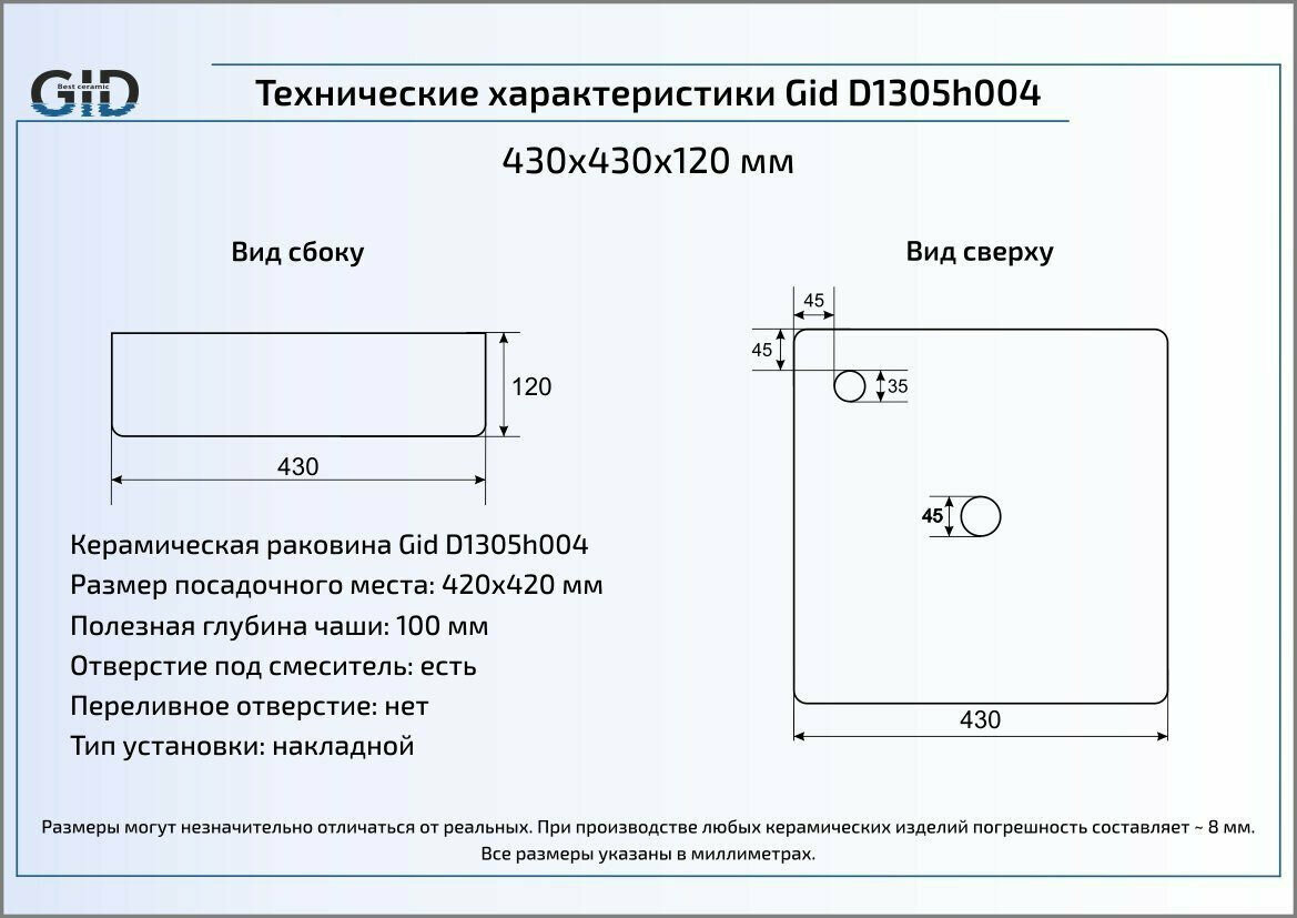 Раковина накладная (43х43) Gid D1305h004 7 450 ₽ Подробнее