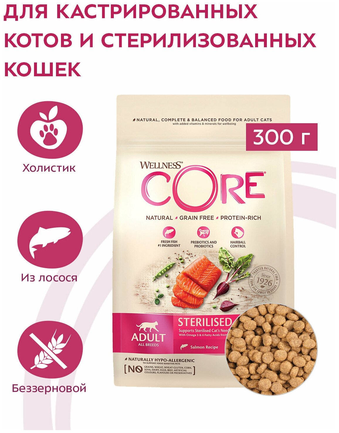 Корм для кошек CORE Sterilised беззерновой, для кастрир.котов и кошек лосось сух. 300г