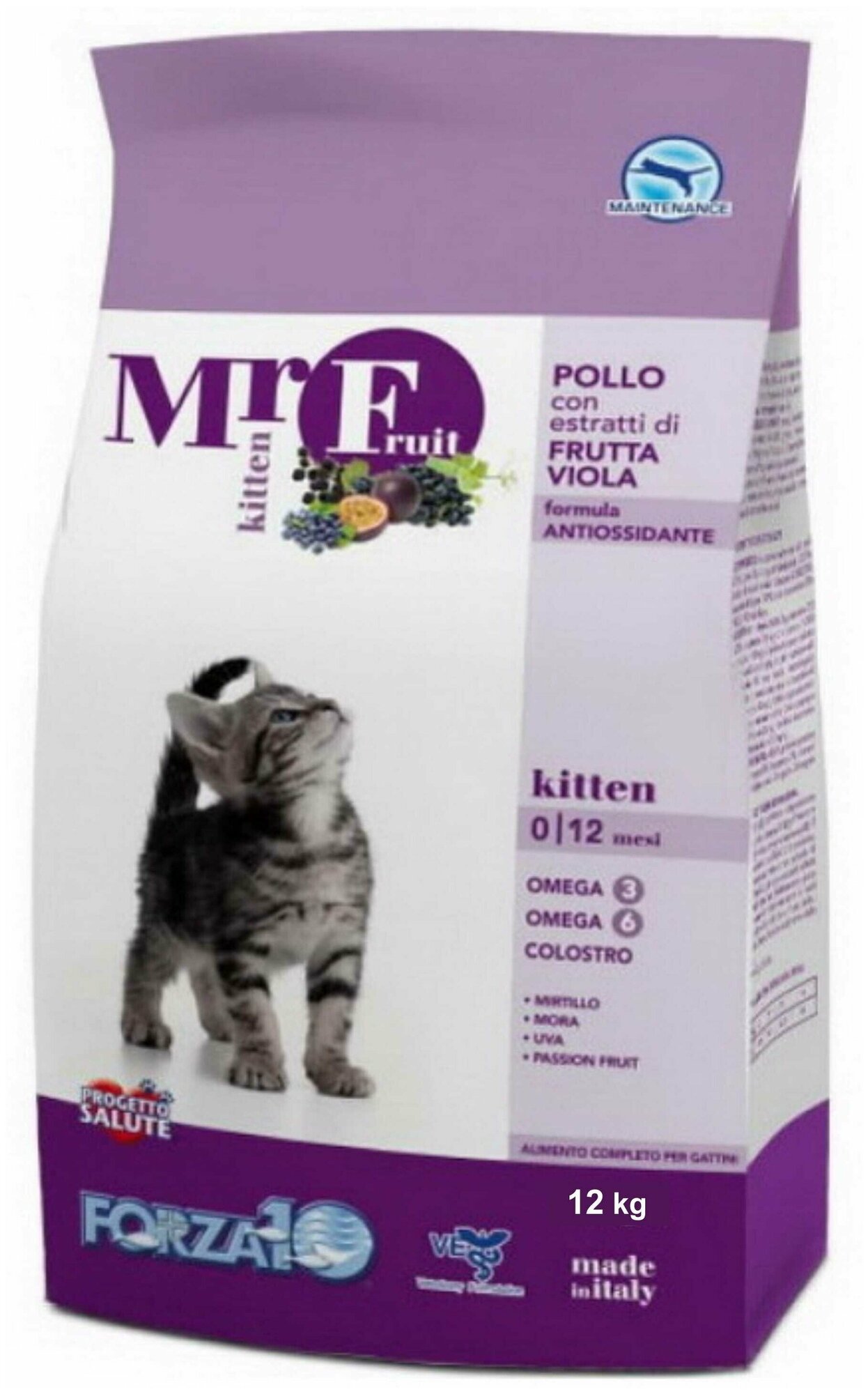 Сухой корм Forza10 Mr. Fruit Kitten Pollo Chicken, для котят с экстрактами фиолетовых фруктов и курицей, 12кг