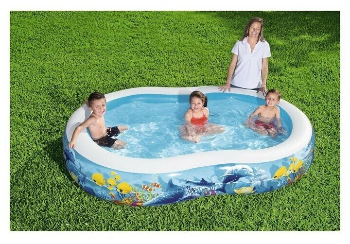 Лучшие цены. Семейный надувной бассейн Bestway "Подводный мир" для взрослых детей от 6 лет. Изготовлен из высококачественного винила, устойчивый, надежный и безопасный. Имеет мягкие стенки с широкими бортиками и жесткое дно из ПВХ-пленки. Бассейн легко надувается и устанавливается на любой ровной поверхности. Для слива воды после использования бассейна предусмотрен специальный сливной клапан. Клапан можно подключить к садовому шлангу. На холодное время года не рекомендуем оставлять бассейн на открытом воздухе. Магазины в вашем городе.