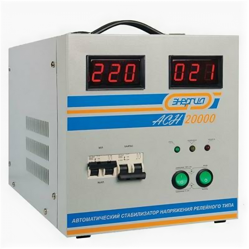 Лучшие цены. Энергия ACH 20000 – стабилизатор напряжения для работы в однофазной сети. Обеспечивает 220 В на выходе с погрешностью в 8% при входном напряжении от 140 до 260 В. Активная мощность устройства составляет от 14000 до 20000 Вт. Магазины в вашем городе.